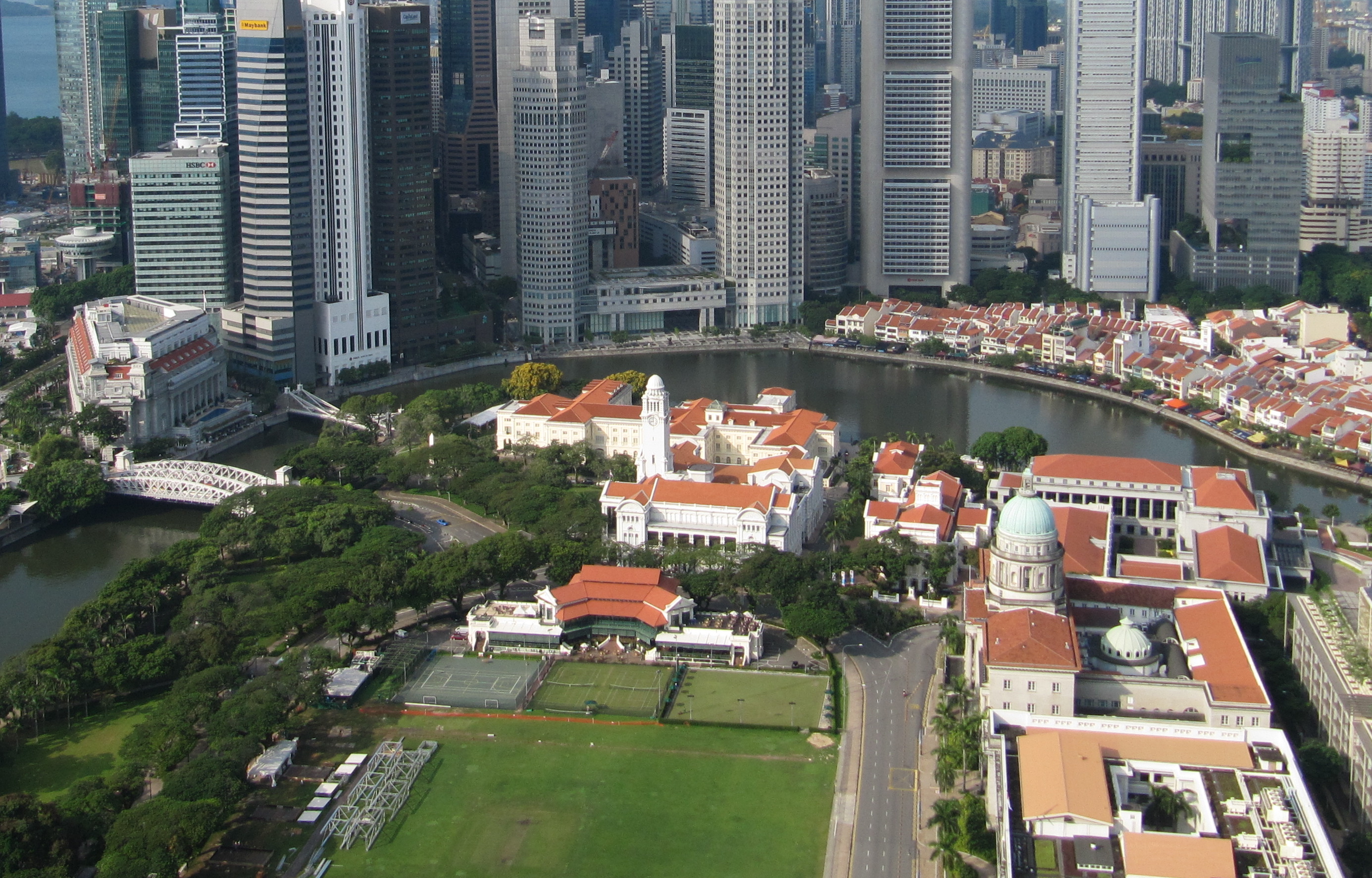 The Fullerton Hotel (Left, next to bridge) and Boat Quay (Right, the row of old shophouses) fringed by skyscrapers