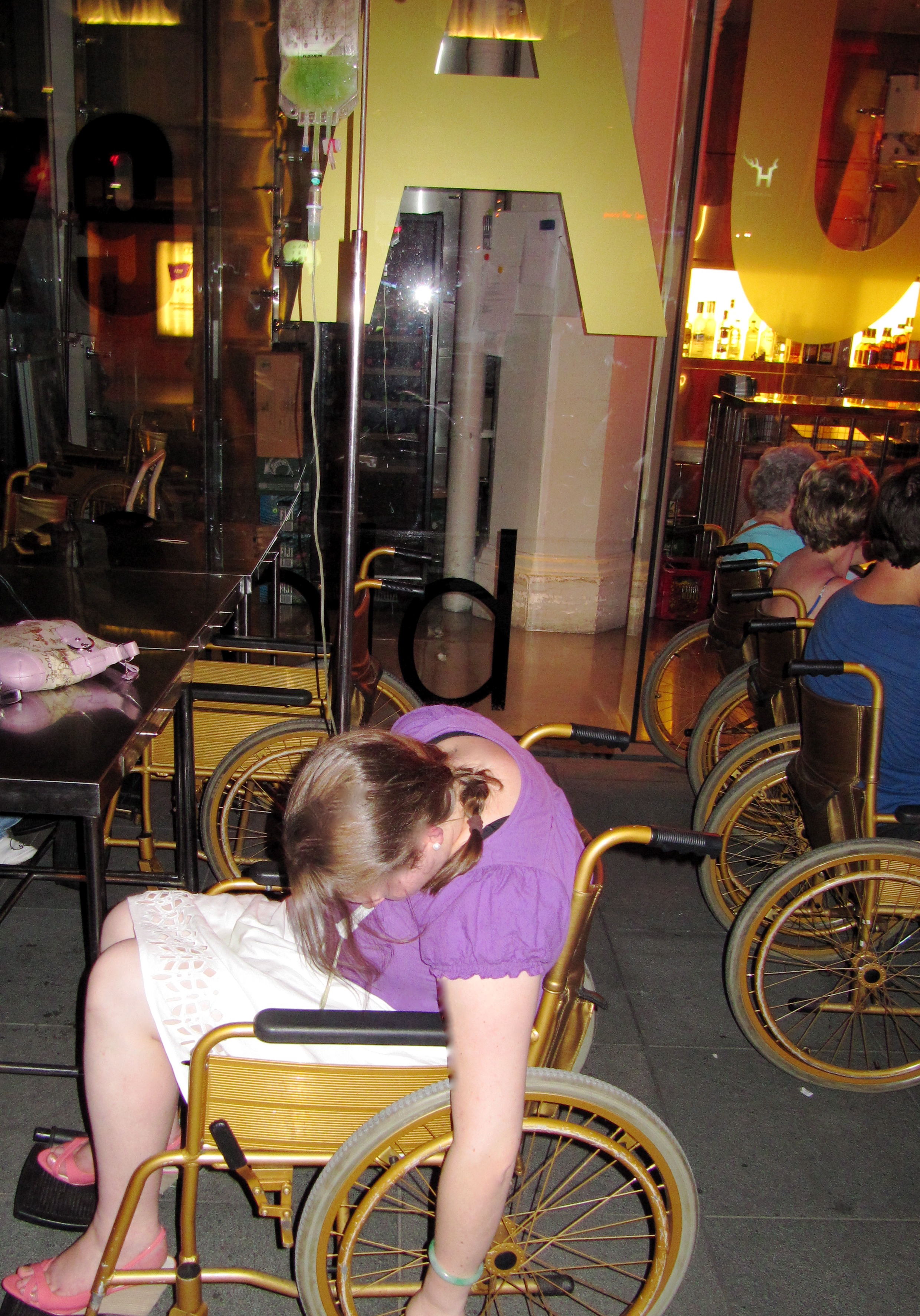 The “patients” however, instead of having a bypass are seated in wheelchairs and served cocktails from the “dispensary” in syringes and iv drips by doctors and nurses – I’m sure they’re all fully qualified – they do look the part… The drinks are quite stong and The Clinic is open till quite late so it’s just as well we have those wheelchairs!